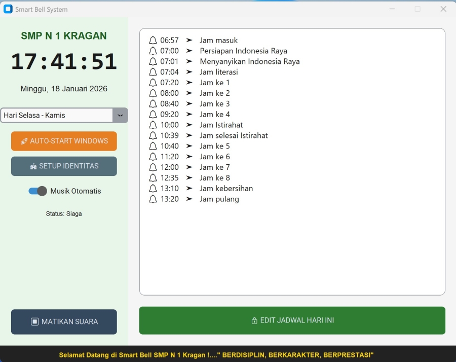 Di era digital, ketepatan waktu adalah kunci. Namun, pemandangan petugas sekolah yang berlari menuju sakelar bel setiap jam pelajaran berganti masih sering kita jumpai. Bagaimana jika sekolah bisa memiliki "asisten pintar" yang tidak hanya membunyikan bel, tapi juga membangun suasana belajar yang nasionalis dan religius secara otomatis?